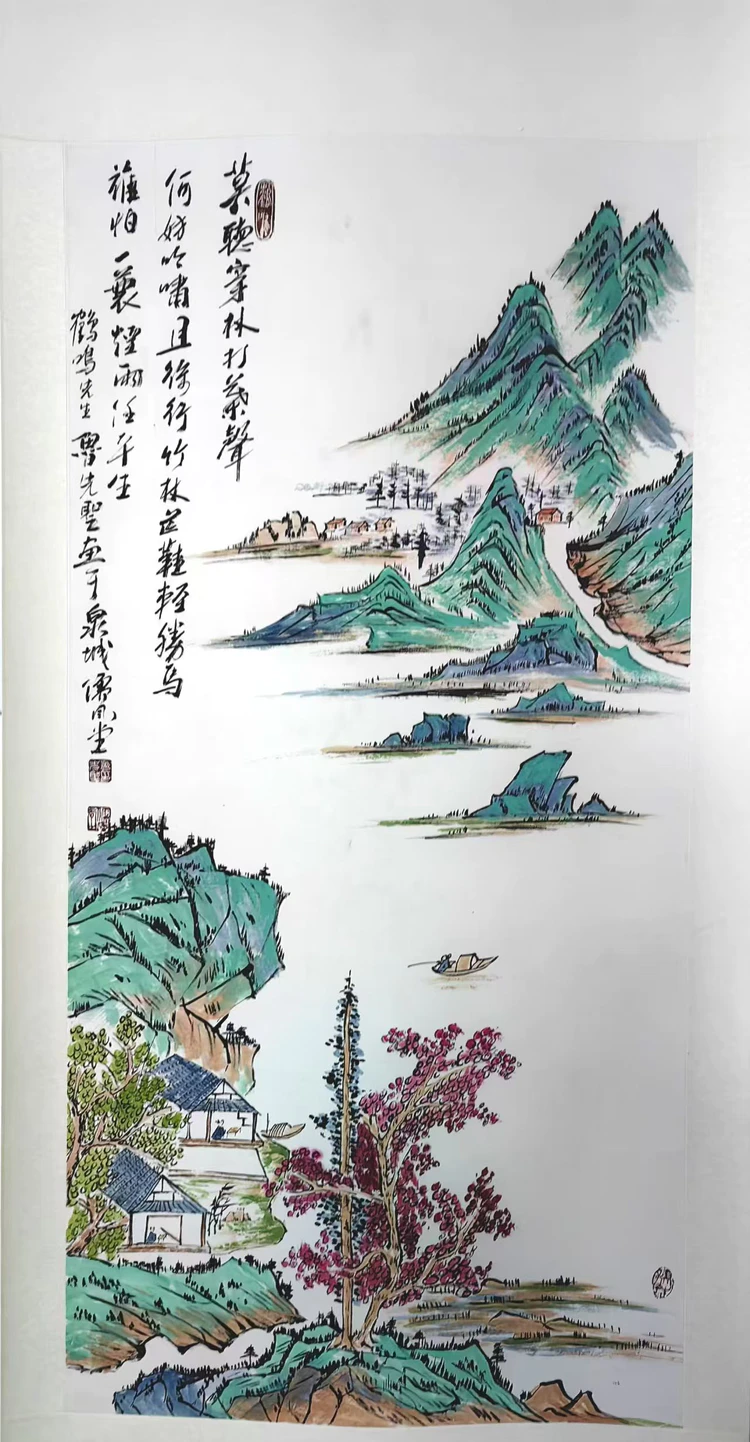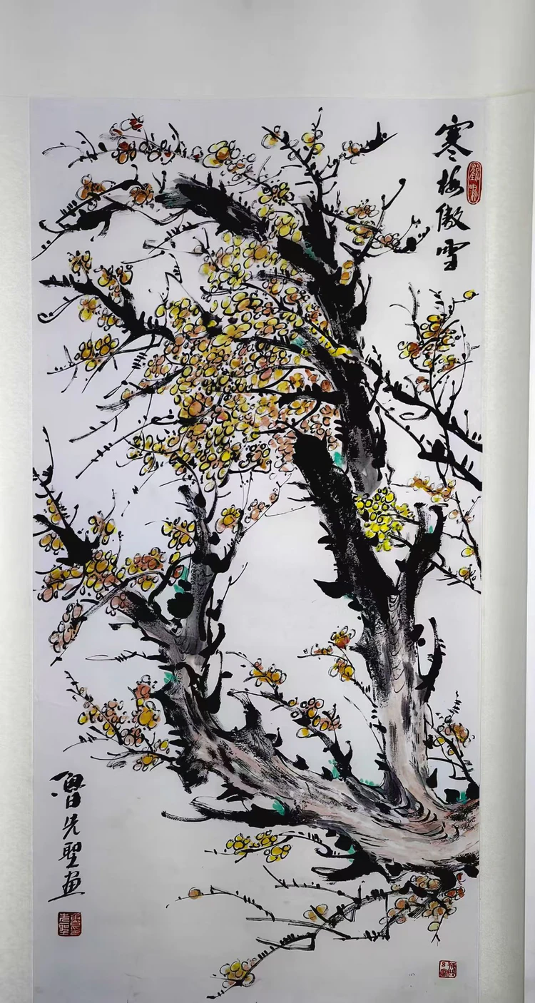 - 国画:独创禅意水墨风格,擅长青绿山水与梅花雄鸡题材。其山水作品以简远意境取胜,《江山如此多娇》通过淡墨皴擦营造出空灵之境;梅花系列则赋予“凌寒独自开”的意象以禅意,画作多次入选山东省文化馆、济南舜耕会展中心等专业展览。