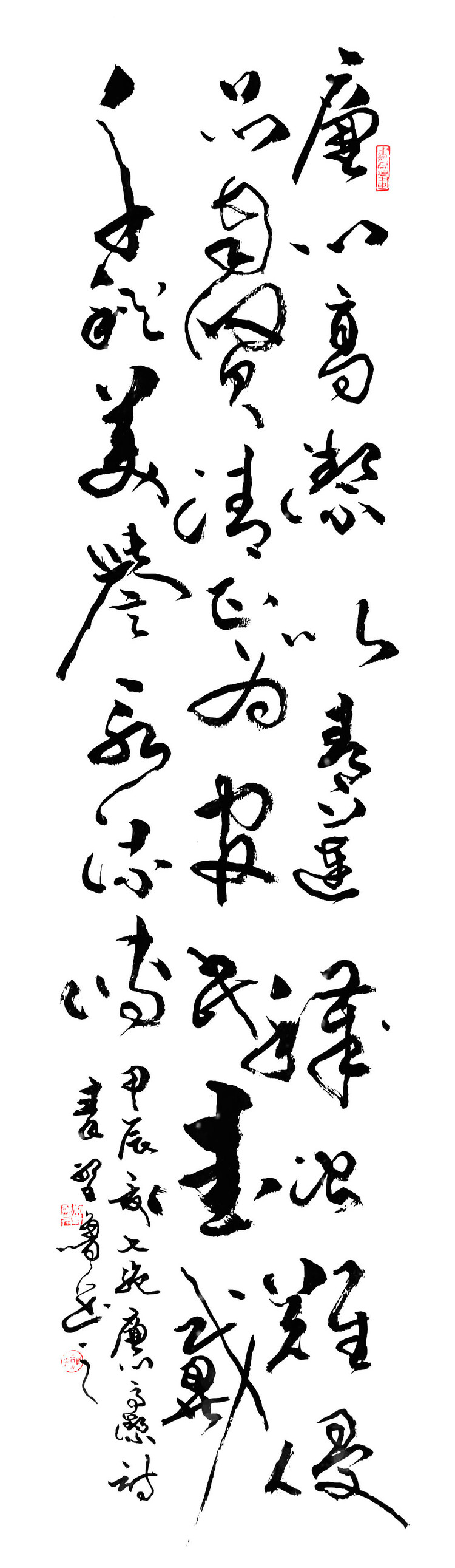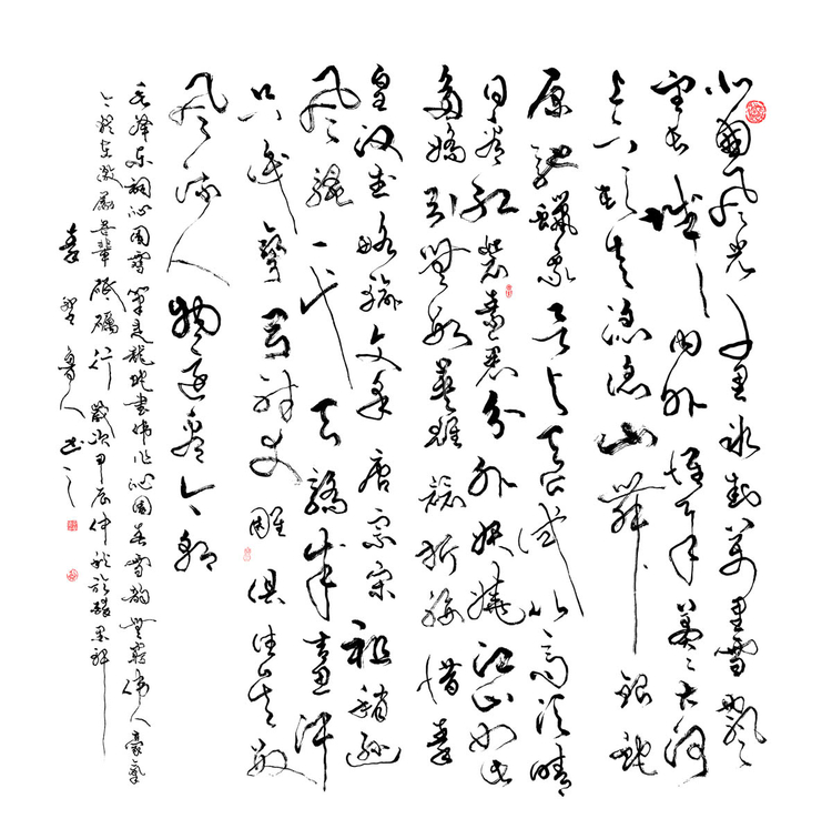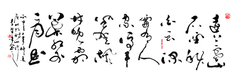 风格融合与创新:在继承传统书法精髓(如王羲之、张旭、怀素等)的基础上,融合个人逸格,形成“劲健秀逸与奔放淋漓兼备”的独特风格。其作品法度森严却气象万千,兼具古风今意,尤以草书见长,代表作《天行健》被誉为“超凡脱俗”的典范。多体兼修:精通行、草、篆、隶、楷五体,作品细腻精致且气韵生动。篆刻亦为所长,治印千余方,刀工老辣意趣高远。