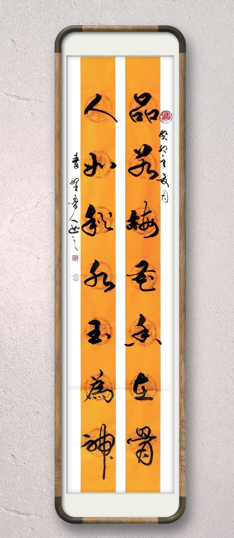 四尺行书对联《品若梅花香在骨·人如秋水玉为神》装饰效果图0