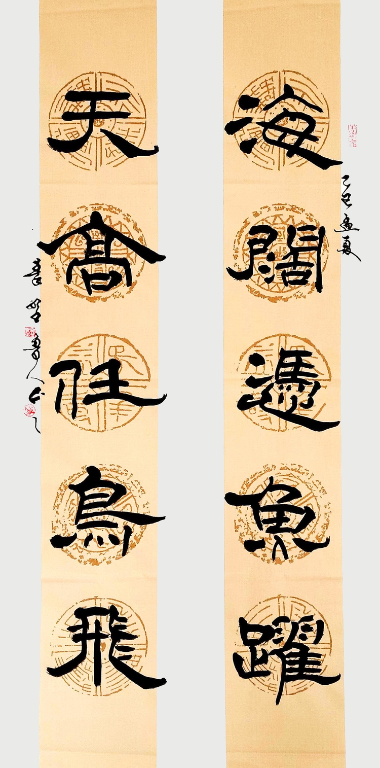 五言隶书对联《海阔凭鱼跃·天高任鸟飞》